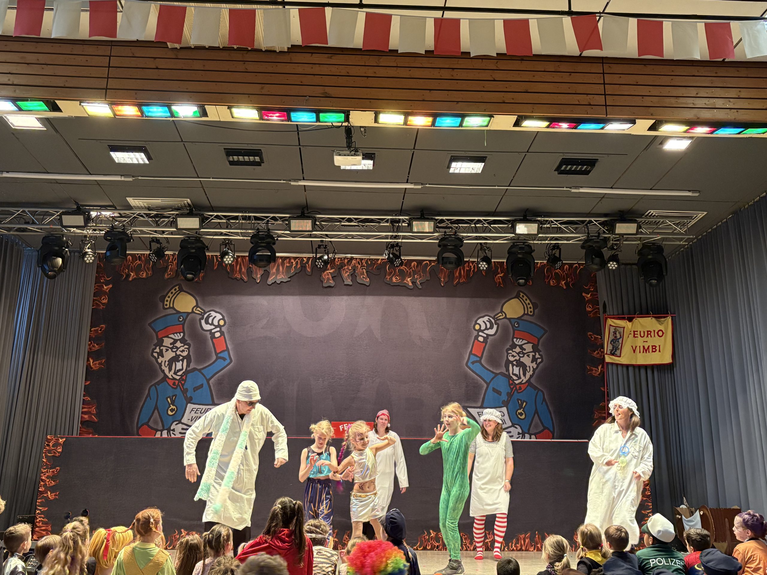 Die Kinder durften kostümiert in die Klassenzimmer kommen und sich gemeinsam mit ihren Lehrkräften auf die Faschingsfeier in der Halle einstimmen. Nach der großen Pause warteten die Kinder darauf, dass die „Sondbachschlorbe“ und die Henkhurst Hexen sie vom Unterricht „befreiten“. Aufgrund des regnerischen Wetters strömten alle direkt in die Halle, um der Guggenmusik zuzuhören, zu tanzen und mitzusingen. In diesem Jahr führten die Henkhurst Hexen einen Tanz auf, der für große Begeisterung bei allen Anwesenden sorgte. Danach ging es mit dem Programm der Schülerinnen und Schüler weiter, die wieder tolle Tänze, Lieder und sogar eine Clownnummer für ihr Publikum vorbereitet hatten. Herr Ebert führte wie immer gekonnt durch das Programm und begleitete die Kinder sowie den Schulchor musikalisch bei ihren Liedbeiträgen. Eine Kostümprämierung gab es auch in diesem Jahr wieder und alle Siegerinnen und Sieger erhielten einen „süßen“ Preis überreicht. Zum Ende des närrischen Schulvormittags führte unsere Schulleiterin Frau Siefert die Abschluss-Polonaise an und geleitete die Kinder so aus der Halle zurück in ihre Klassenzimmer bevor sie von dort in die wohlverdienten Faschingsferien entlassen wurden.