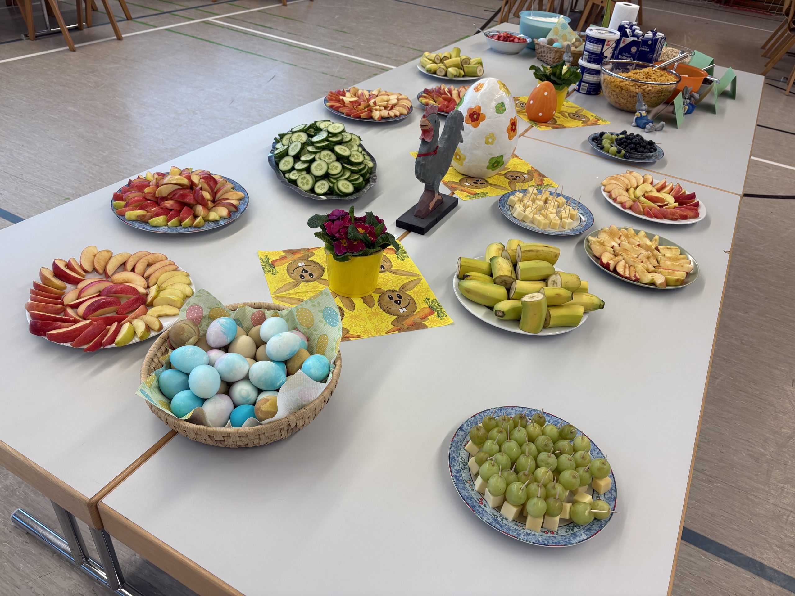Am Freitag vor den Osterferien trafen wir uns alle in der Tullahalle zu unserem ersten gemeinsamen Osterfrühstück. Jede Klasse bereitete hierfür mit ihren Lehrkräften etwas für das gesunde Buffet vor. So wurde von den Kindern Obst und Gemüse geschnitten, Ostereier gefärbt, Obstspieße gerichtet, eine Müsli-Station vorbereitet sowie Brote bestrichen und belegt. Hauptsache gesund und lecker. Danach versammelten sich alle, um gemeinsam zu frühstücken. Natürlich wurden die Tische auch noch bunt dekoriert, denn das Auge isst ja bekanntlich mit. Nach der Stärkung ging es dann wieder zurück in die Klassenzimmer bevor die Kinder nach Unterrichtsende in die wohlverdienten Osterferien entlassen wurden.
